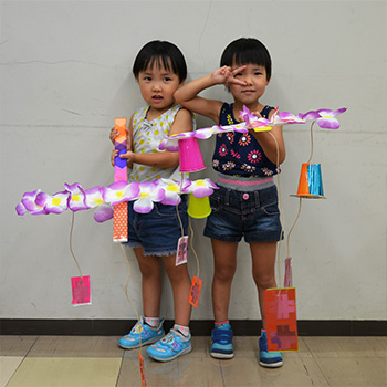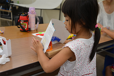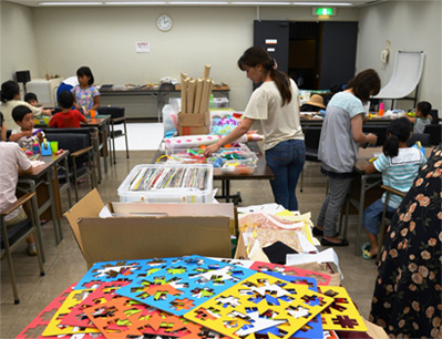 当館では,「毎週土曜はアートの日!」と銘打ち,アートイベントを土曜日に集中させた事業を行っています。なかでも,ものをつくるワークショップは人気があり,企画展や時節にちなんだものなど,年に数回実施しています。このワークショップは,夏休み中ということから,できるだけ多くの方に気軽に参加できるものを,と企画しました。決して目新しい企画ではありませんが,“おまつりのような,見た目ににぎやかでワクワクするような場をつくりたい”という思いもあり,実施する運びとなりました。