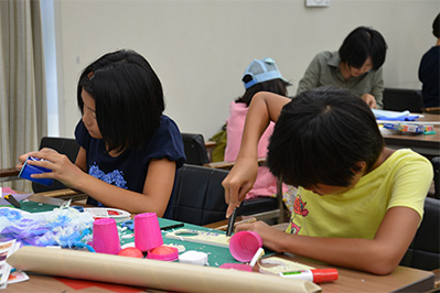 この夏,鳥取県立博物館では,「素材まつりだ!なにつくる?」と題した造形ワークショップを開催しました。館内のあらゆるものをかき集め,それらを自由に使える場をセッティングし,思う存分ものづくりをしていただくという企画です。子供たちの「できたー!」や「またやりたい!」の声も多く,にぎやかな会場となりました。