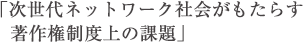 文化庁では、昨年度、次世代ネットワーク社会における著作権制度のあり方についての調査研究会を設け、近年のインターネットの急速な普及や端末の小型化等を背景に、従来の著作権法が想定していない様々な著作物の利用・管理形態が広がっている状況等を踏まえ、新しい時代に即した著作権制度のあり方について、長期的な視野に立った創造的な検討を行いました。