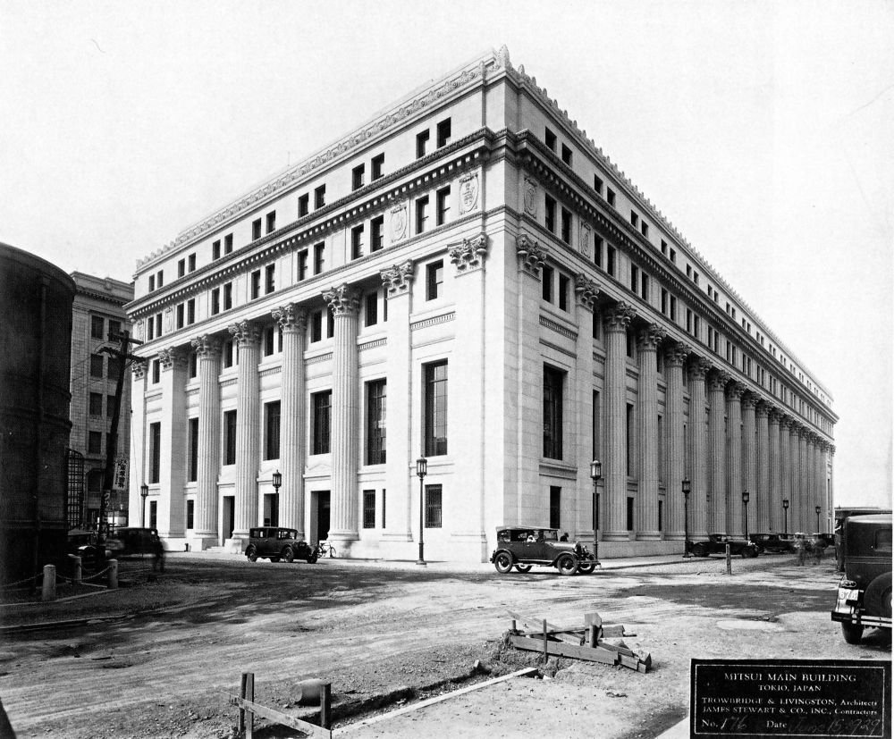 三井本館は、東京・日本橋にある歴史的なオフィスビルです。かつての三井財閥を構成する三井銀行・三井物産などの主要各社の本社が集まる、財閥の"顔" として建てられました。大正12年(1923)の関東大震災で、明治期に建てられた旧本館が被害を受けたことで建て替えが決まり 、アメリカの建築事務所が設計を、アメリカの建設会社が施工を担当しました。大正15年(1926)に工事が始まり、昭和4年(1929)に完成しました。外壁には花崗岩が使われ、接道面には堂々としたコリント式の大きな柱が並ぶ、格調高い外観が特徴です。平成10年(1998)には、国の重要文化財に指定されました。