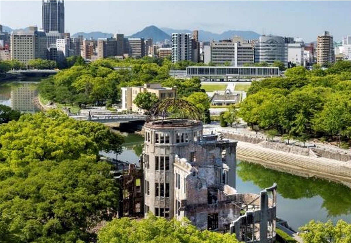 上の写真は、冒頭の写真とは逆方向から撮影したものです。一番手前に、令和7年(2025)に特別史跡に指定された原爆ドームがあり、写真には写っていませんが平和大通りに向かって軸線が設定されています。