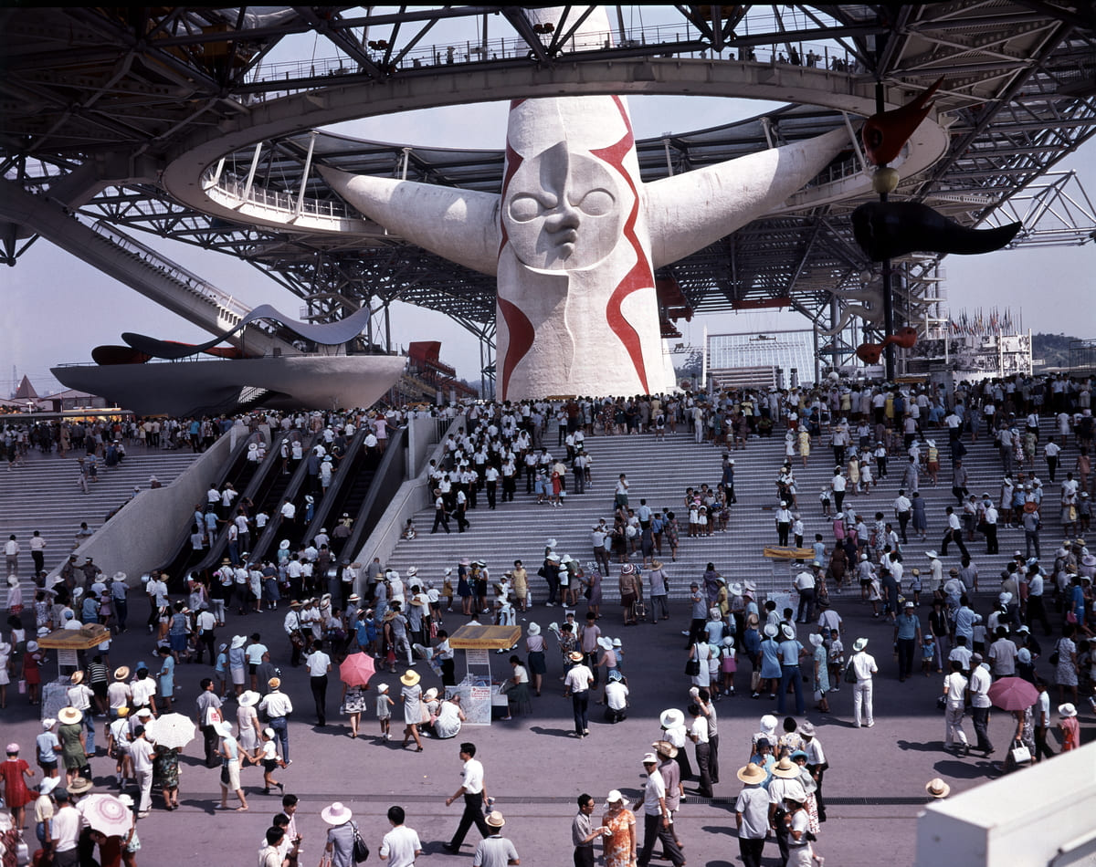 太陽の塔は、昭和45年(1970)に開催された大阪万博のパビリオンの一つとして建設されました。デザインは芸術家・岡本太郎が担当し、建築設計と工事監理は、丹下健三門下の吉川健が主宰する集団制作建築事務所が担当しました。当時は、塔の胴体と腕の内部を通り、腕先の出口から空中展示施設でもある大屋根へつながる動線になっていました。太陽の塔は、高度経済成長期の日本を象徴する文化遺産として貴重です。