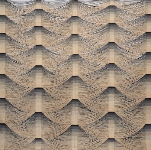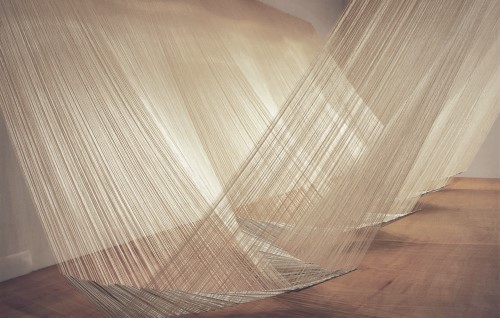 次に小林が注目したのは糸の張力です。竹ひごやアルミ棒の両端に糸を結んでピンと張ったものをBOW(弓)と呼び、それを複数重ねることで多彩な表情を生みだしました。また、作品は二次元から三次元へと展開し、あくまでも「糸」を主体としつつ、KAZAOTOやYUMIOTO、MIZUOTO、HANAOTOといったタイトルからもわかるように、空間に自然を現出させるような作品を発表しました。そしてそれらは、極めて「日本的」な作品として世界で高く評価されたのです。
