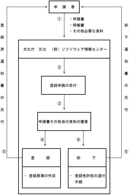 - プログラムの著作物に関しては財団法人ソフトウェア情報センターが指定登録機関として登録事務を行っています。